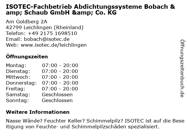 1 ISOTEC-Fachbetrieb Abdichtungssysteme Bobach & Schaub GmbH & Co. KG (Entfernung: 5,60 km) Löhdorfer Straße 156-176, 42699 Solingen 2 ISOTEC-Fachbetrieb Abdichtungssysteme Bobach & Schaub GmbH & Co. KG (Entfernung: 14,22 km) Steinackerstraße 28, 42859 Remscheid 3 ISOTEC-Fachbetrieb Abdichtungssysteme Bobach & Schaub GmbH & Co. KG (Entfernung: 19,06 km) Dahler Straße 65, 42389 Wuppertal 4 ISOTEC Fachbetrieb, Abdichtungssysteme Bobach GmbH & Co. KG (Entfernung: 0,86 km) Hochstr. 33, 42799 Leichlingen 5 Praxis für Sprachtherapie Jeschke & Schaub Praxis für Logopädie (Entfernung: 3,12 km) Burscheider Str. 129, 51381 Leverkusen 6 |