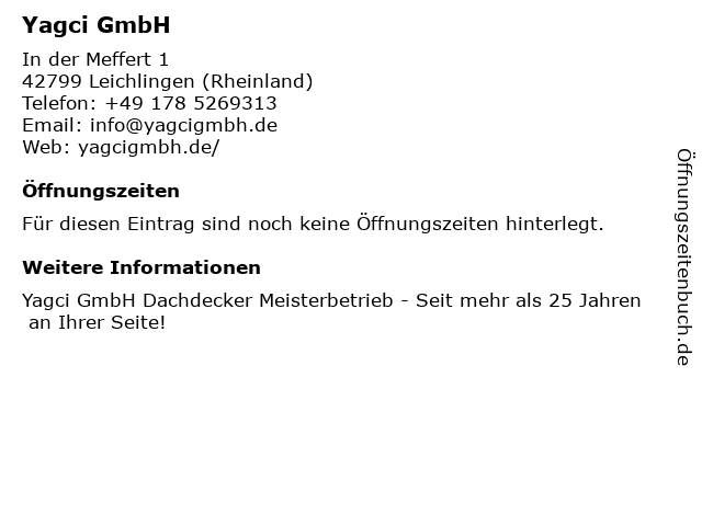 | Öffnungszeiten Yagci GmbH in Leichlingen (Rheinland) anzeigen | |