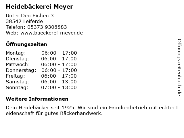 | Öffnungszeiten Heidebäckerei Meyer in Leiferde anzeigen | |