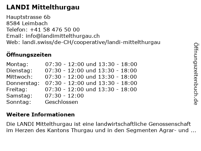| Öffnungszeiten LANDI Mittelthurgau in Leimbach anzeigen | |
