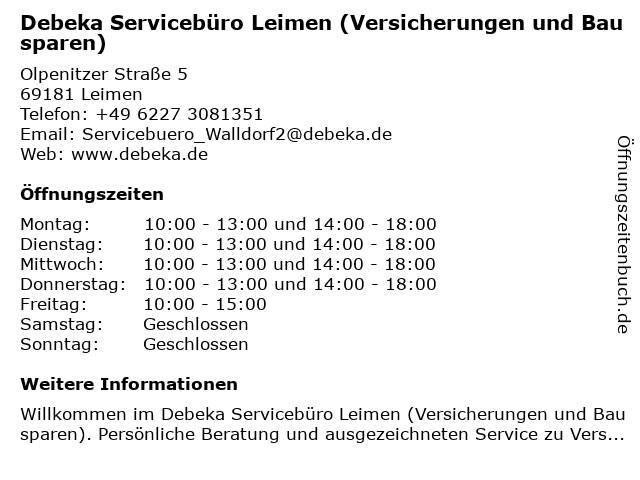 6 Debeka Servicebüro Heidelberg Dossenheimer Landstr. (Versicherungen und Bausparen) (Entfernung: 8,47 km) Dossenheimer Landstraße 83, 69121 Heidelberg |