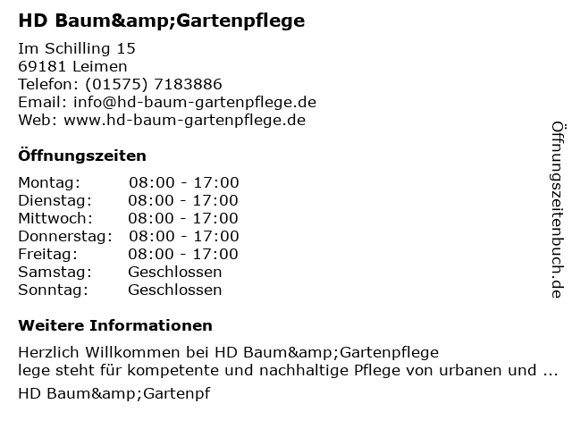 | Öffnungszeiten HD Baum&Gartenpflege in Leimen anzeigen | |
