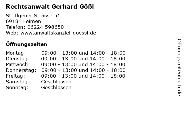 | Öffnungszeiten Rechtsanwalt Gerhard Gößl in Leimen anzeigen | |