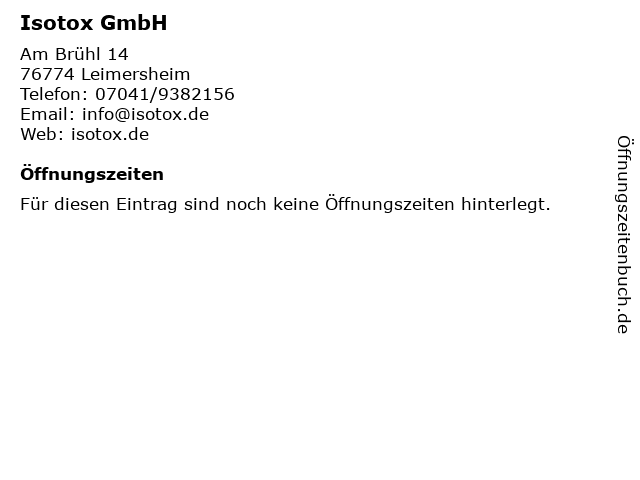 | Öffnungszeiten Isotox GmbH in Leimersheim anzeigen | |