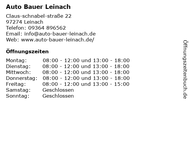 | Öffnungszeiten Auto Bauer Leinach in Leinach anzeigen | |
