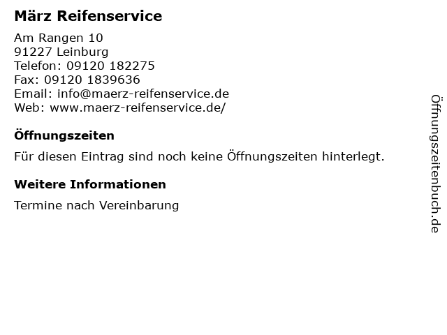 | Öffnungszeiten März Reifenservice in Leinburg anzeigen | |