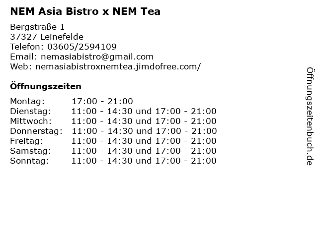 | Öffnungszeiten NEM Asia Bistro x NEM Tea in Leinefelde anzeigen | |