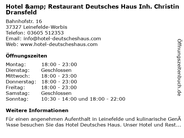 Branchen & Suchbegriffe zu Hotel & Restaurant Deutsches Haus Inh. Christin Dransfeld:christin, deutsches, haus, hotel, restaurant |