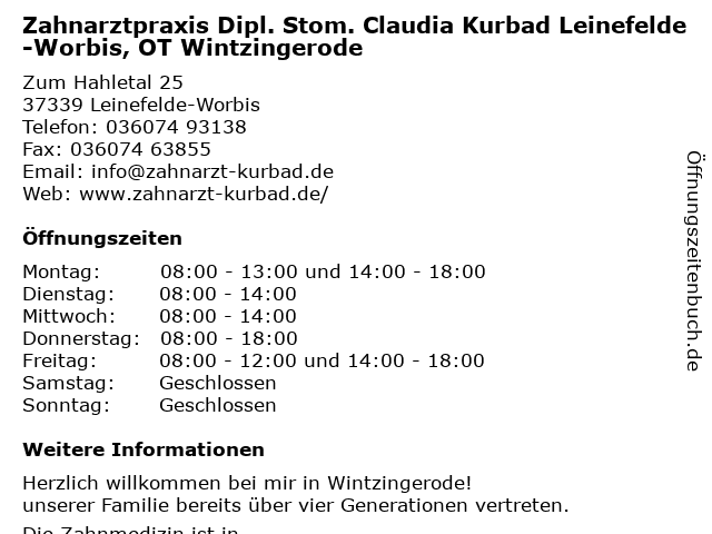 Branchen & Suchbegriffe zu Zahnarztpraxis Dipl. Stom. Claudia Kurbad Leinefelde-Worbis, OT Wintzingerode:claudia, dipl., kurbad, ot, stom., wintzingerode, worbis, zahnarztpraxis |
