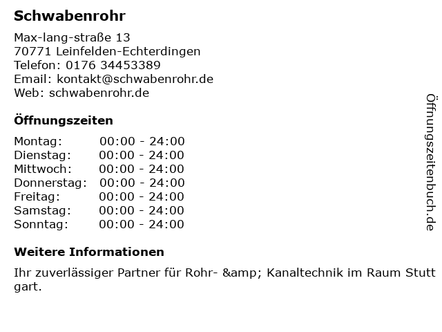 | Öffnungszeiten Schwabenrohr in Leinfelden-Echterdingen anzeigen | |