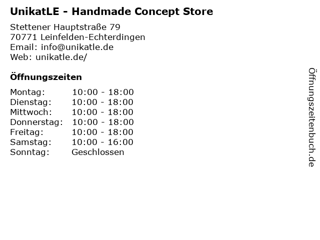 | Öffnungszeiten UnikatLE - Handmade Concept Store in Leinfelden-Echterdingen anzeigen | |