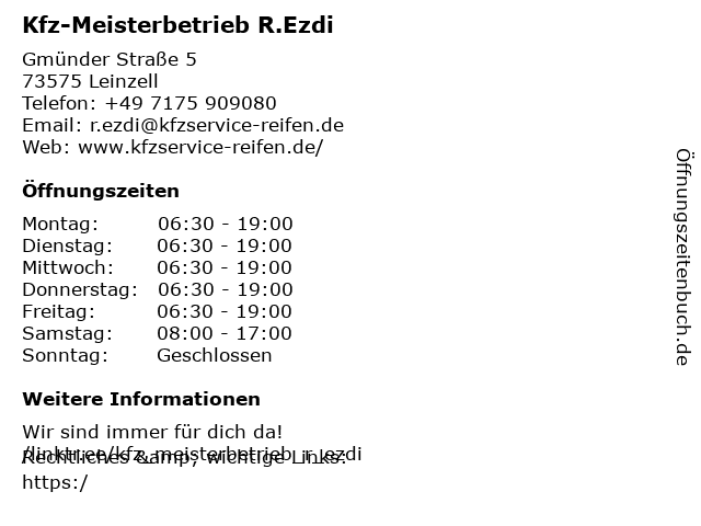 | Öffnungszeiten Kfz-Meisterbetrieb R.Ezdi in Leinzell anzeigen | |
