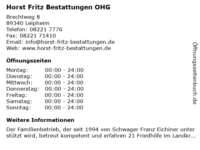 | Öffnungszeiten Horst Fritz Bestattungen OHG in Leipheim anzeigen | |