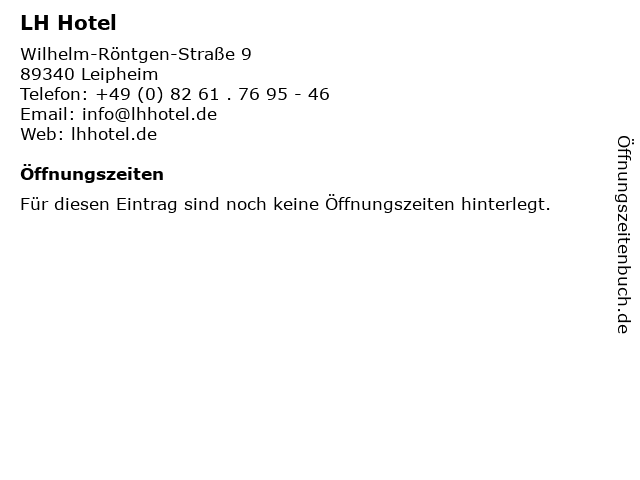| Öffnungszeiten LH Hotel in Leipheim anzeigen | |