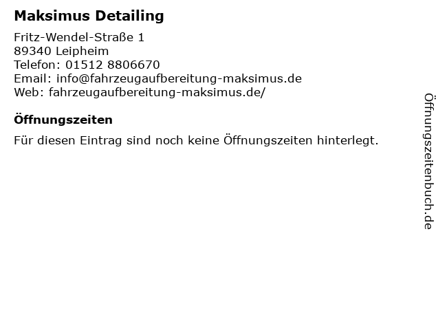 | Öffnungszeiten Maksimus Detailing in Leipheim anzeigen | |