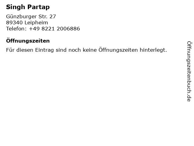 | Öffnungszeiten Singh Partap in Leipheim anzeigen | |