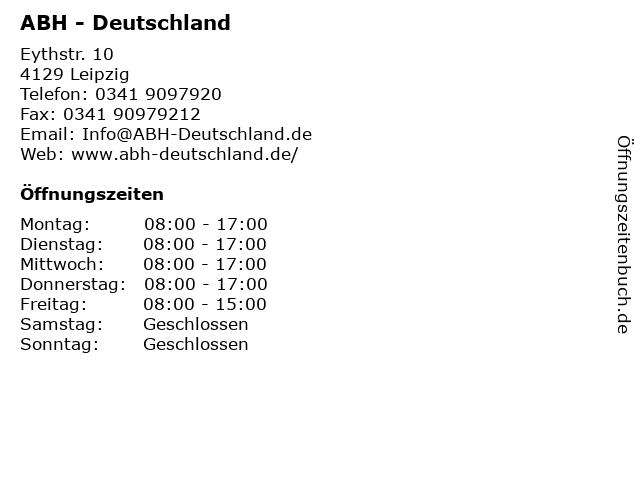 | Öffnungszeiten ABH - Deutschland in Leipzig anzeigen | |