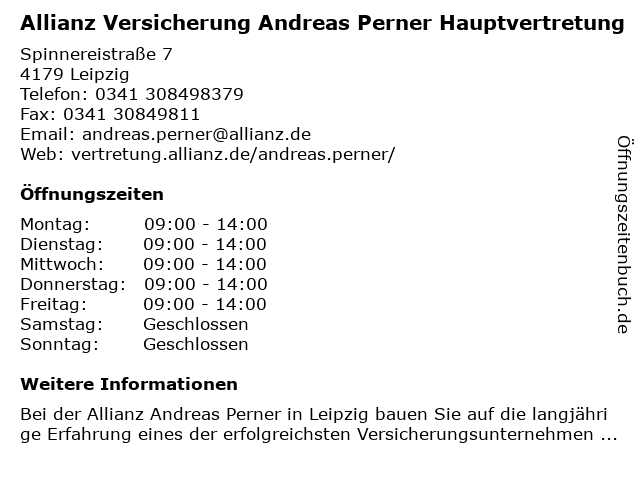 1 Allianz Versicherung Andreas Perner Hauptvertretung (Entfernung: 3,08 km) Kiewer Straße 1-5, 04209 Leipzig 2 Allianz Versicherung Andreas Perner Hauptvertretung (Entfernung: 3,09 km) Kiewer straße 1-5, 04209 Leipzig 3 Allianz Versicherung Pia Weber Hauptvertretung (Entfernung: 0,00 km) Spinnereistraße 7, 04179 Leipzig 4 Allianz Versicherung Stephan Schäff Hauptvertretung (Entfernung: 0,59 km) Plautstraße 6, 04179 Leipzig 5 Allianz Versicherung Matthias Seidel Hauptvertretung (Entfernung: 1,16 km) Karl-heine-straße 58 a, 04229 Leipzig 6 |