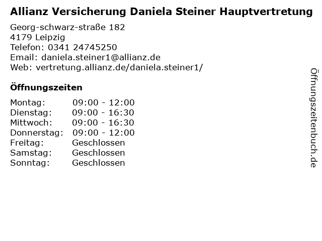 4 Allianz Versicherung Robert Schünert Hauptvertretung (Entfernung: 1,42 km) Leipziger Straße 66, 04178 Leipzig 5 Allianz Versicherung Pascal Seltmann Hauptvertretung (Entfernung: 2,32 km) Plautstraße 6, 04179 Leipzig 6 Steiner GmbH Wohnungsvermietung Vermietung Bauträger- Häuserverwaltung (Entfernung: 3,19 km) Waldstr. 82 -84, 04105 Leipzig |