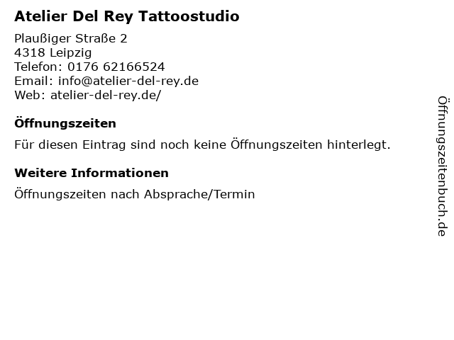 | Öffnungszeiten Atelier Del Rey Tattoostudio in Leipzig anzeigen | |