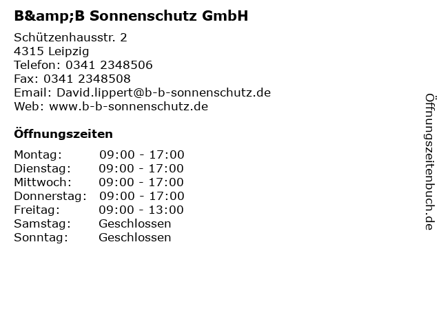 | Öffnungszeiten B&B Sonnenschutz GmbH in Leipzig anzeigen | |