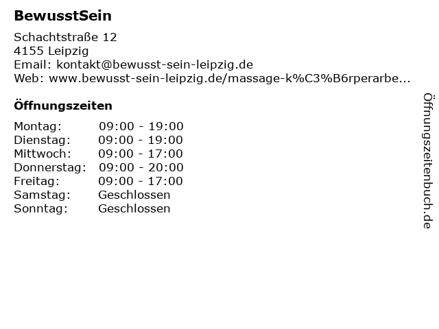 | Öffnungszeiten BewusstSein in Leipzig anzeigen | |