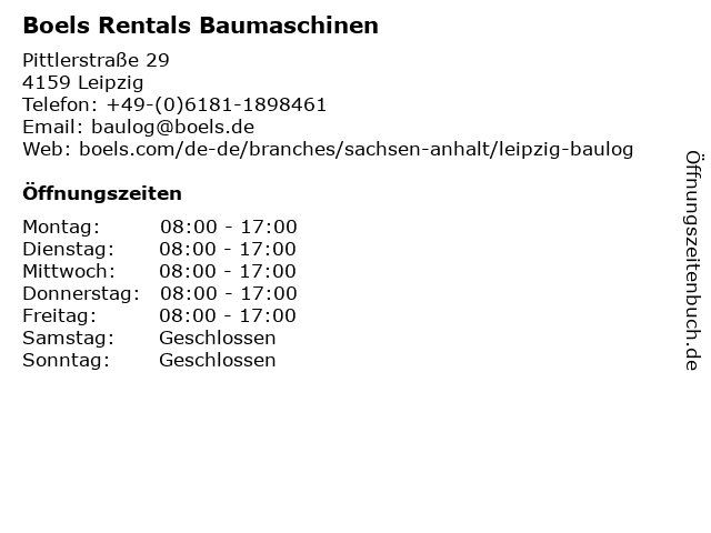| Öffnungszeiten Boels Rentals Baumaschinen in Leipzig anzeigen | |