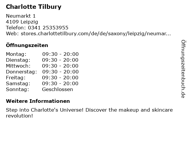 | Öffnungszeiten Charlotte Tilbury in Leipzig anzeigen | |