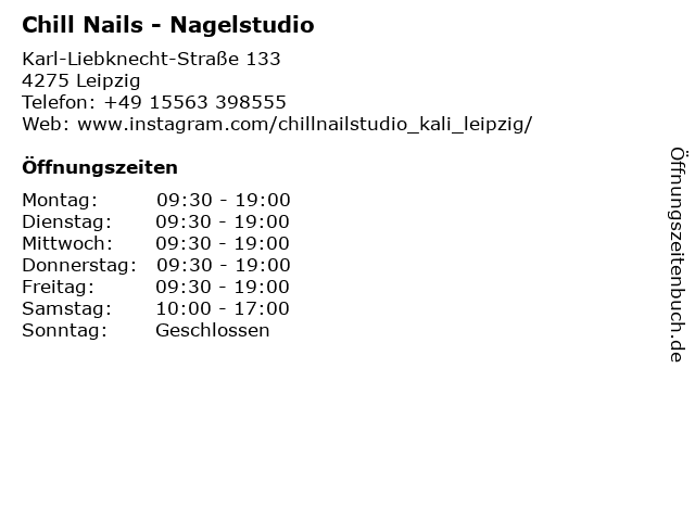 | Öffnungszeiten Chill Nails - Nagelstudio in Leipzig anzeigen | |