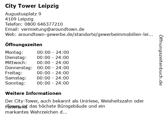 | Öffnungszeiten City Tower Leipzig in Leipzig anzeigen | |