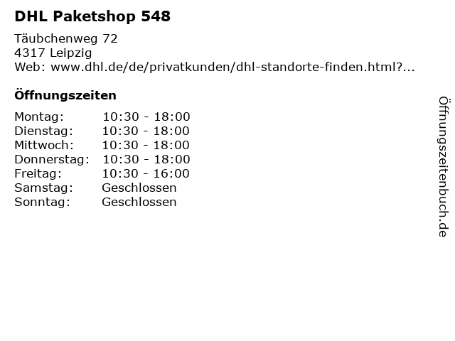 | Öffnungszeiten DHL Paketshop 548 in Leipzig anzeigen | |