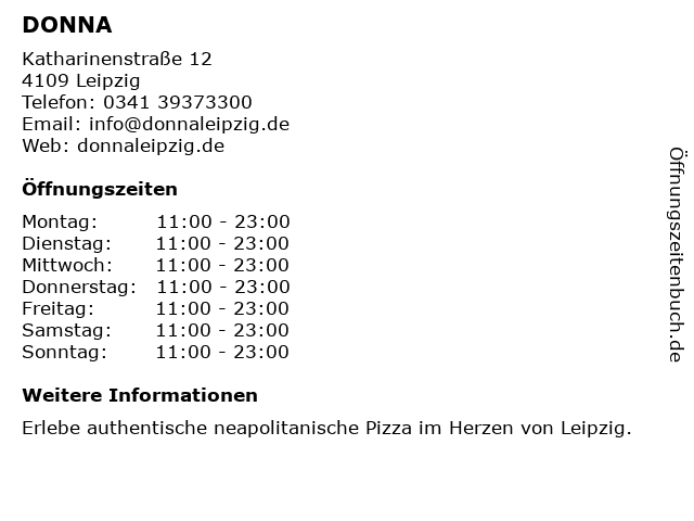| Öffnungszeiten DONNA in Leipzig anzeigen | |