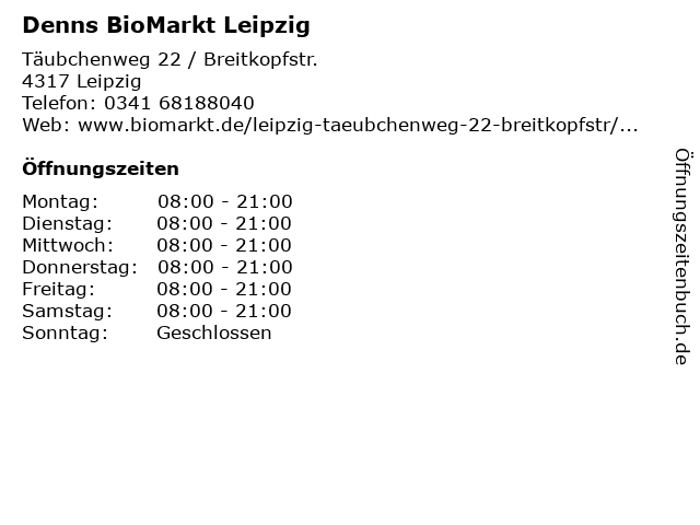 | Öffnungszeiten Denns BioMarkt Leipzig in Leipzig anzeigen | |