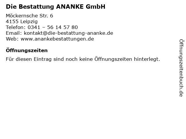 | Öffnungszeiten Die Bestattung ANANKE GmbH in Leipzig anzeigen | |