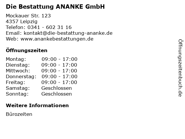 | Öffnungszeiten Die Bestattung ANANKE GmbH in Leipzig anzeigen | |