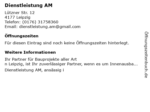 | Öffnungszeiten Dienstleistung AM in Leipzig anzeigen | |