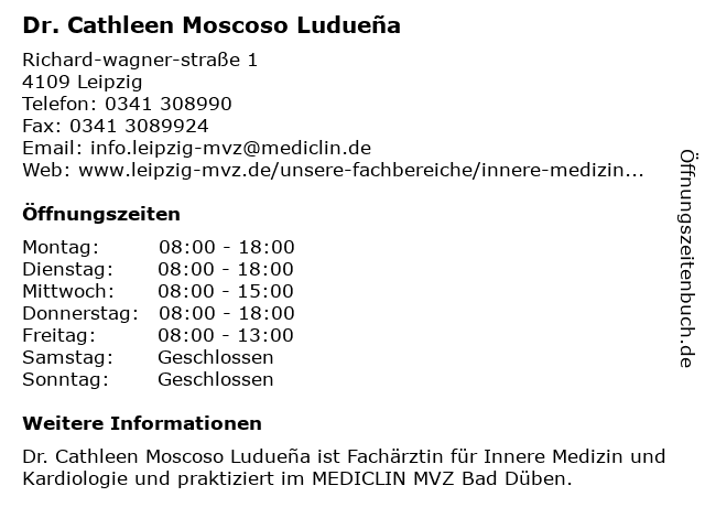 | Öffnungszeiten Dr. Cathleen Moscoso Ludueña in Leipzig anzeigen | |