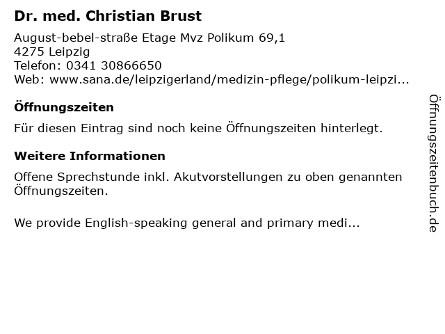 | Öffnungszeiten Dr. med. Christian Brust in Leipzig anzeigen | |