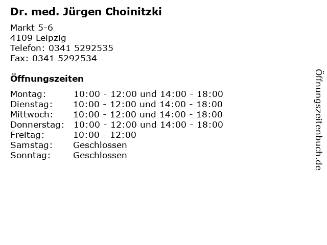 | Öffnungszeiten Dr. med. Jürgen Choinitzki in Leipzig anzeigen | |