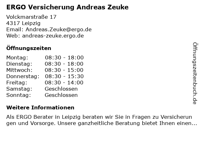 | Öffnungszeiten ERGO Versicherung Andreas Zeuke in Leipzig anzeigen | |