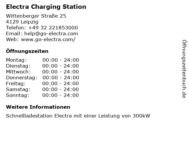 | Öffnungszeiten Electra Charging Station in Leipzig anzeigen | |