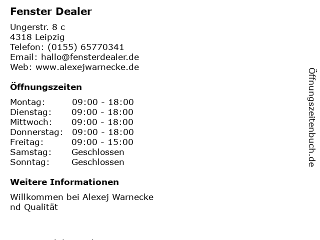 | Öffnungszeiten Fenster Dealer in Leipzig anzeigen | |