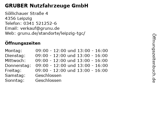 | Öffnungszeiten GRUBER Nutzfahrzeuge GmbH in Leipzig anzeigen | |
