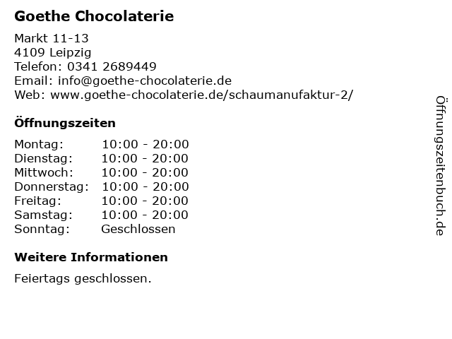 | Öffnungszeiten Goethe Chocolaterie in Leipzig anzeigen | |