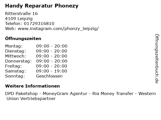 | Öffnungszeiten Handy Reparatur Phonezy in Leipzig anzeigen | |