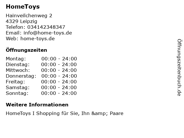 | Öffnungszeiten HomeToys in Leipzig anzeigen | |