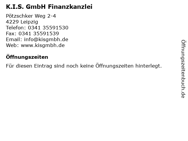 | Öffnungszeiten K.I.S. GmbH Finanzkanzlei in Leipzig anzeigen | |