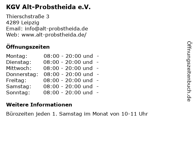 | Öffnungszeiten KGV Alt-Probstheida e.V. in Leipzig anzeigen | |