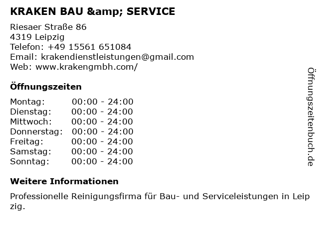 | Öffnungszeiten KRAKEN BAU & SERVICE in Leipzig anzeigen | |