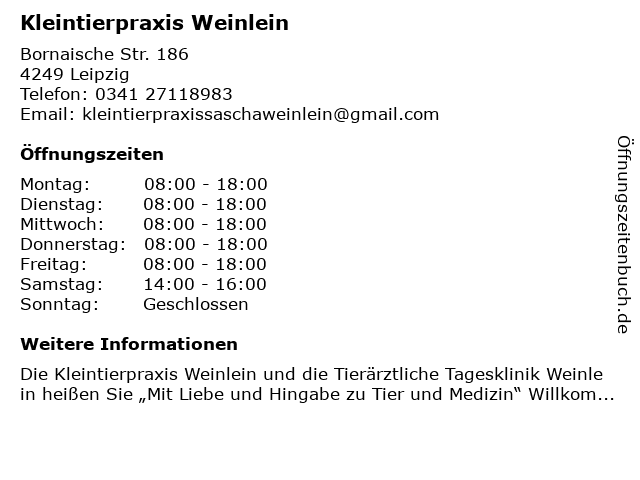 | Öffnungszeiten Kleintierpraxis Weinlein in Leipzig anzeigen | |